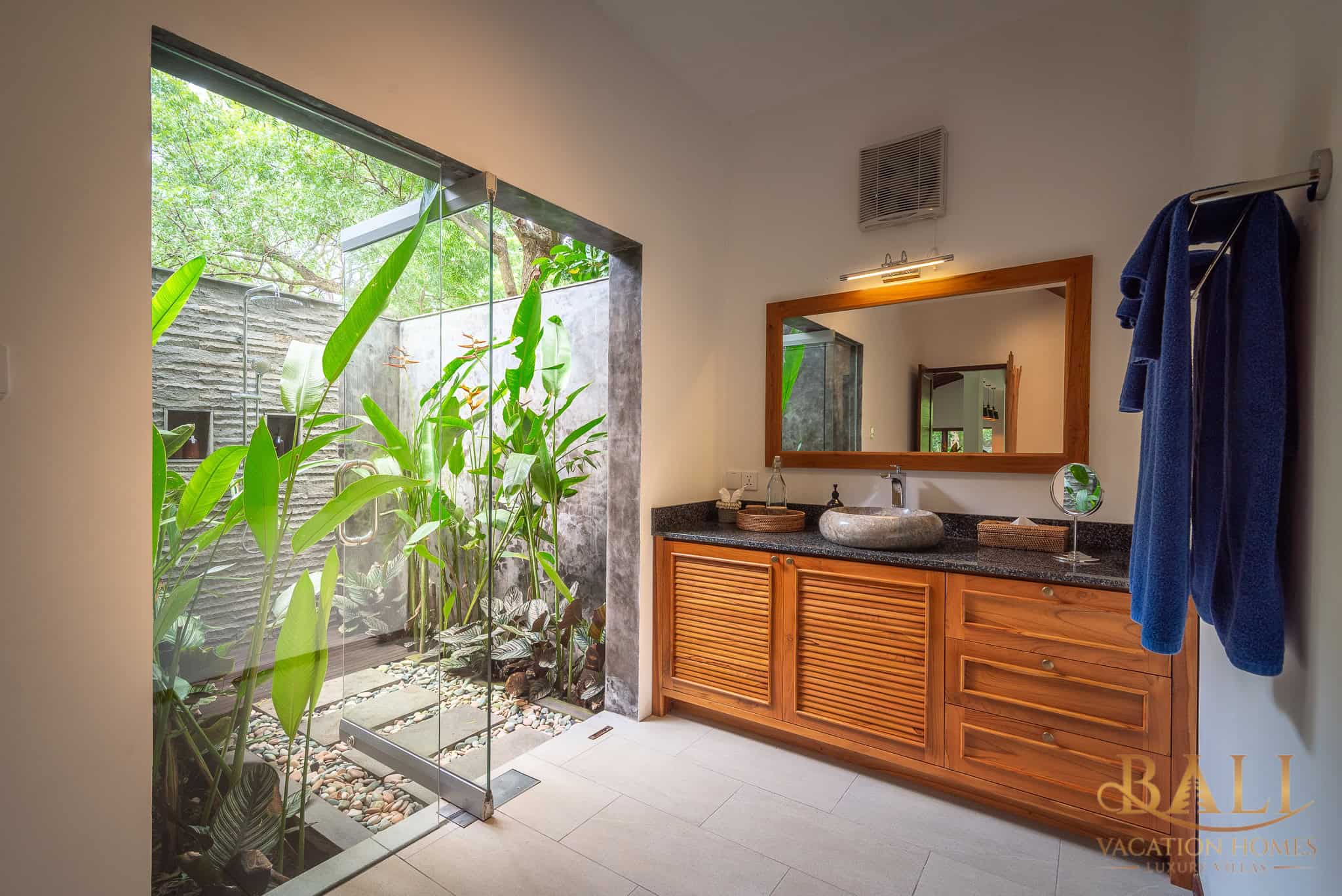 Our beachfront oasis spans 25 are of lush, private land directly on the crystal-clear waters of the Bali Sea. While the shoreline itself is government-owned, all facilities are reserved exclusively for Villas Ananda guests. These include our sun loungers, changing room, toilet, and freshwater showers.